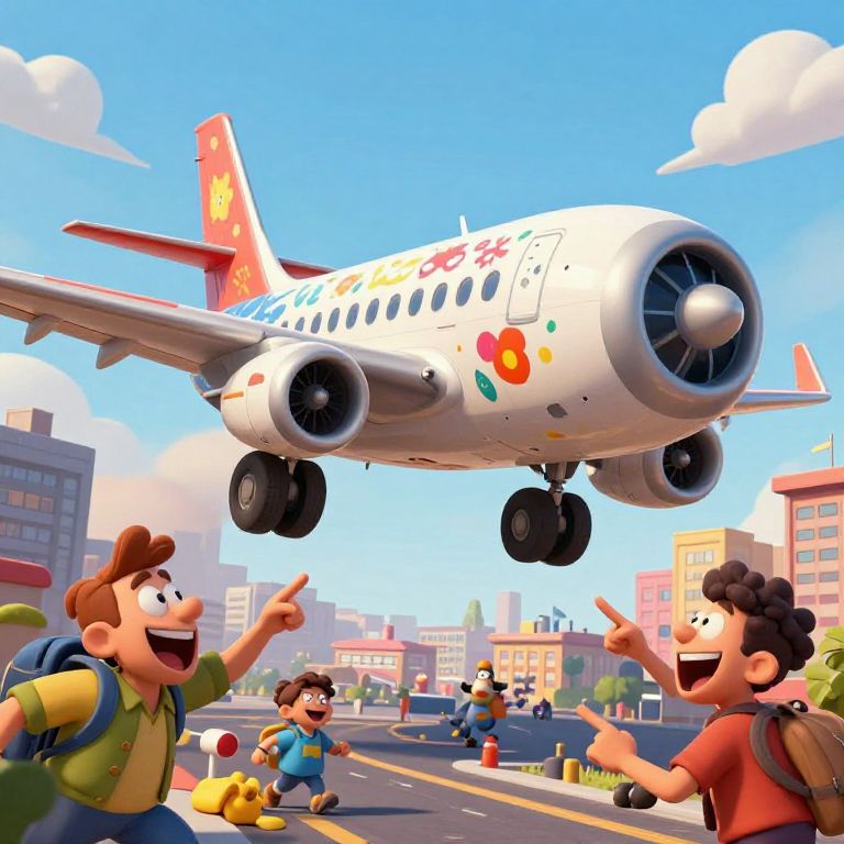 Funniest planes shown as silly, exaggerated aircraft with comical designs, oversized wheels, and playful patterns, flying low above a lively cityscape, with characters laughing and pointing, rendered in a dynamic, cartoon style full of joy and humor