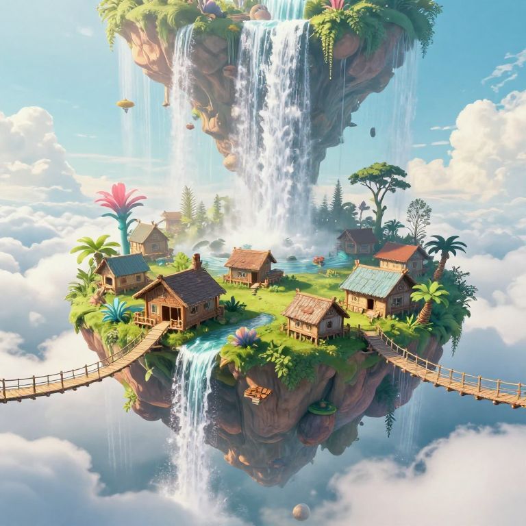 This vibrant digital illustration depicts a floating island village, surrounded by a cascading waterfall. The island is lush with greenery, featuring several rustic wooden houses with red and blue roofs. Palm trees and various plants add to the tropical atmosphere. A wooden bridge connects the island to the lower clouds. The sky is bright blue with fluffy white clouds, and a small hot air balloon hovers in the background. The waterfall splits into two tiers, adding a sense of dynamic movement. The island's texture is rocky, contrasting with the soft, fluffy clouds below.