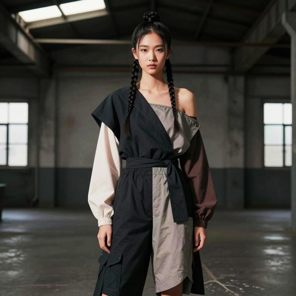 Bubble Braid hairstyle on fashion model, wearing edgy outfit, in photo studio, captured in fashion editorial style with bright tone.