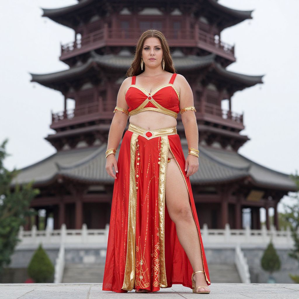 Plus Size Adult Costume Woman, woman in a red and gold outfit standing in front of a pagoda
