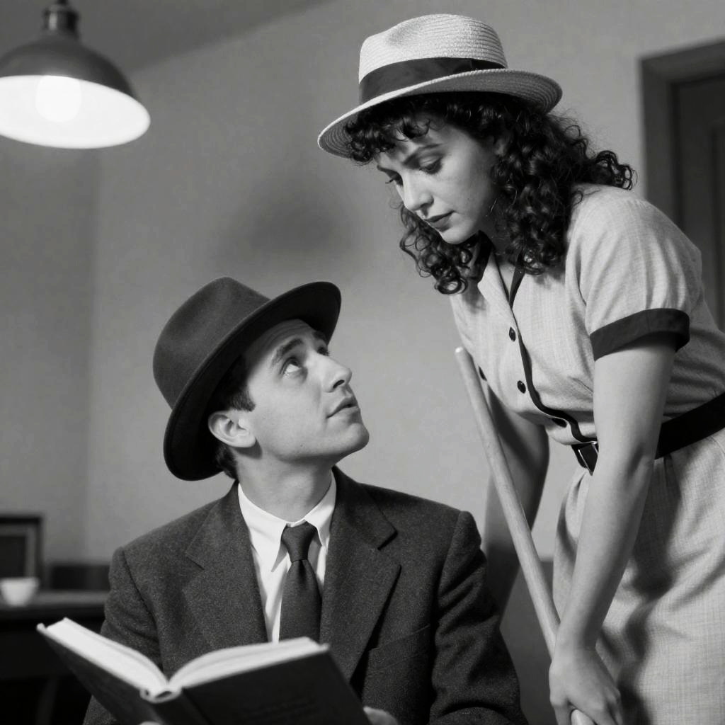 Black-and-white photograph of three people. Woman on left with curled hair, dark collar, gesturing towards man in center, who has slicked-back hair, wearing tweed suit, giving thumbs-up. Man on right, wearing hat, dark suit, patterned tie, looking downward. All three stand close together, facing left. Simple gradient background.
