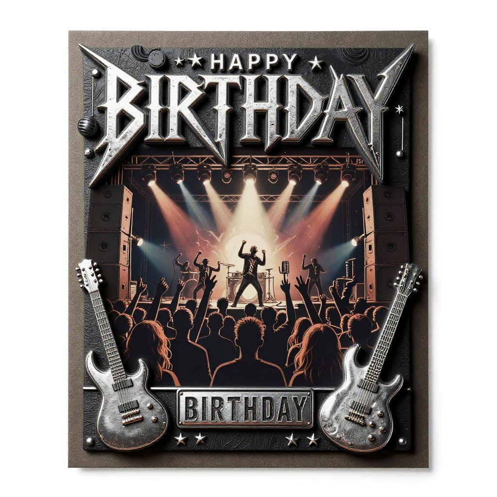 Heavy metal birthday card showing a thunderous rock concert stage with a screaming crowd, intense spotlights, and giant speakers, dark colors and metallic silver embossing, incorporating skulls and guitars to create a powerful birthday greeting.
