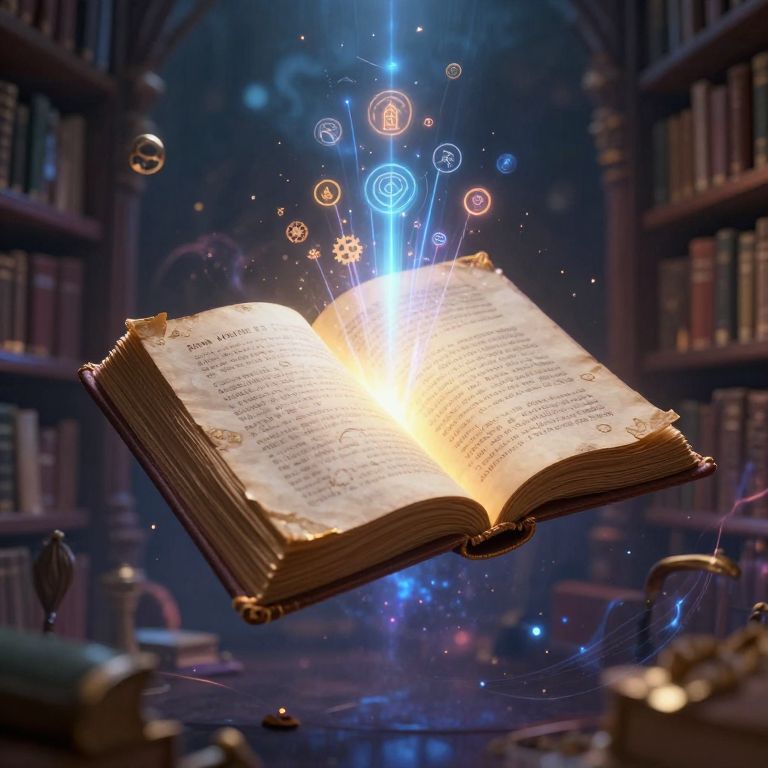 Photograph of an open glowing book floating in a library, surrounded by magical blue and white circular symbols and sparkles.