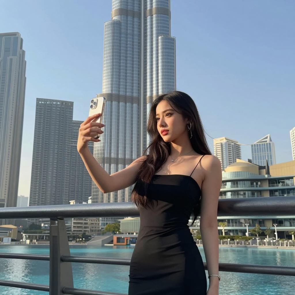 A young woman with long dark hair wearing a black dress taking a selfie outdoors in a modern cityscape, with skyscrapers including a very tall building resembling Burj Khalifa in the background, railing and water body nearby, clear blue sky, soft warm natural lighting