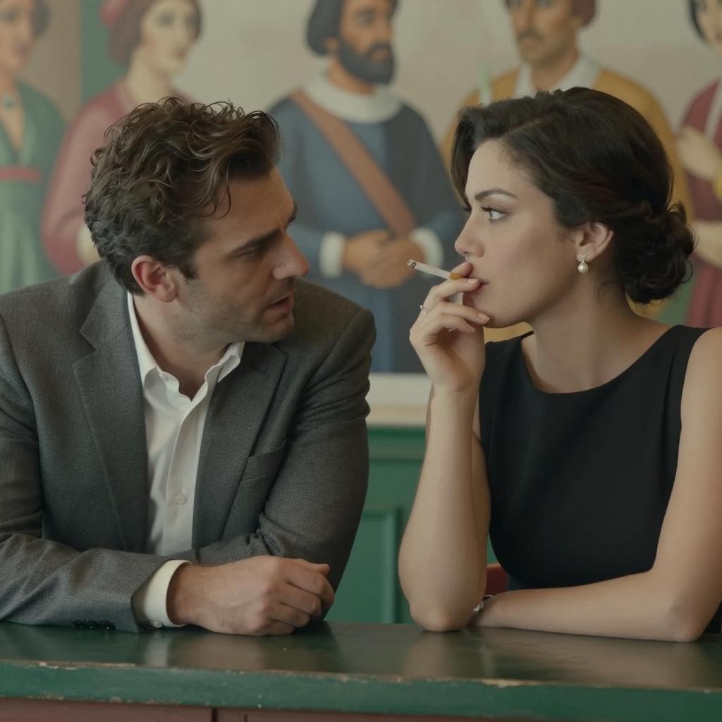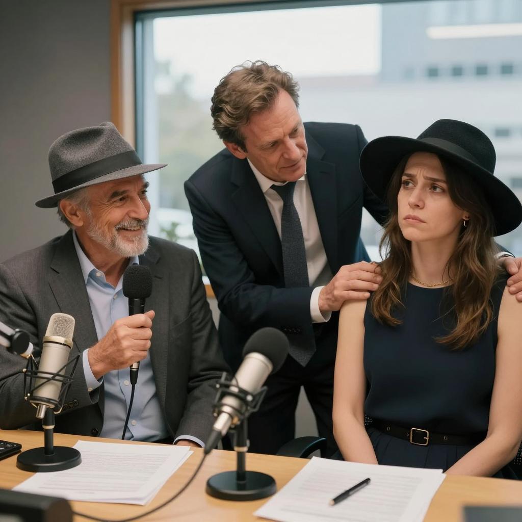 A man and woman in a studio. Man in light suit, dark tie, and fedora holds a vintage microphone, looking to the side. Woman in dark pinstripe suit, white collar, and dark hair with waves, smiles and holds a microphone, looking towards the camera. Both have intense expressions. Background includes a circular window and blurred studio equipment.