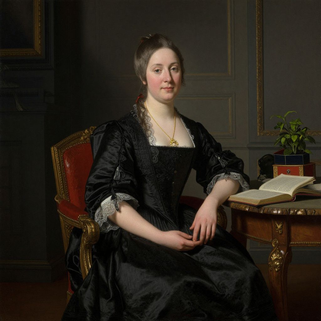 This is a photograph of a fair-skinned woman with dark brown hair, styled in an elegant updo, seated in a richly decorated room. She is wearing a black, Victorian-era dress with intricate lace trim on the sleeves and neckline, and a gold necklace with a pendant. She is sitting in a red, upholstered, wooden chair with gold accents, positioned beside a small wooden table. On the table, there is an open book and a potted plant. The background features dark, paneled walls with gold trim, creating a formal and elegant atmosphere. The woman has a calm, composed expression and is looking directly at the camera.