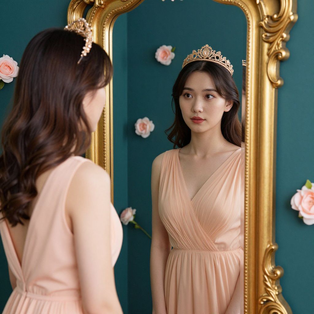 Photograph of an Asian woman with fair skin and long, wavy black hair, wearing a delicate gold tiara and a sleeveless, V-neck, peach-colored gown with a cinched waist. She stands before an ornate, gold-framed mirror in a room with teal walls adorned with pink roses. Her reflection shows her serious expression and direct gaze. The image has a soft, romantic atmosphere, highlighting the elegance of her attire and the luxurious setting. The roses and gold frame add a touch of vintage charm.