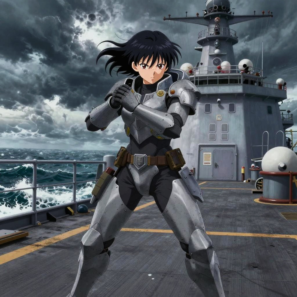 Anime girl marine in combat gear, ready for battle on a warship deck, stormy skies and rough seas behind her, intense expression and highly detailed armor, action-packed scene