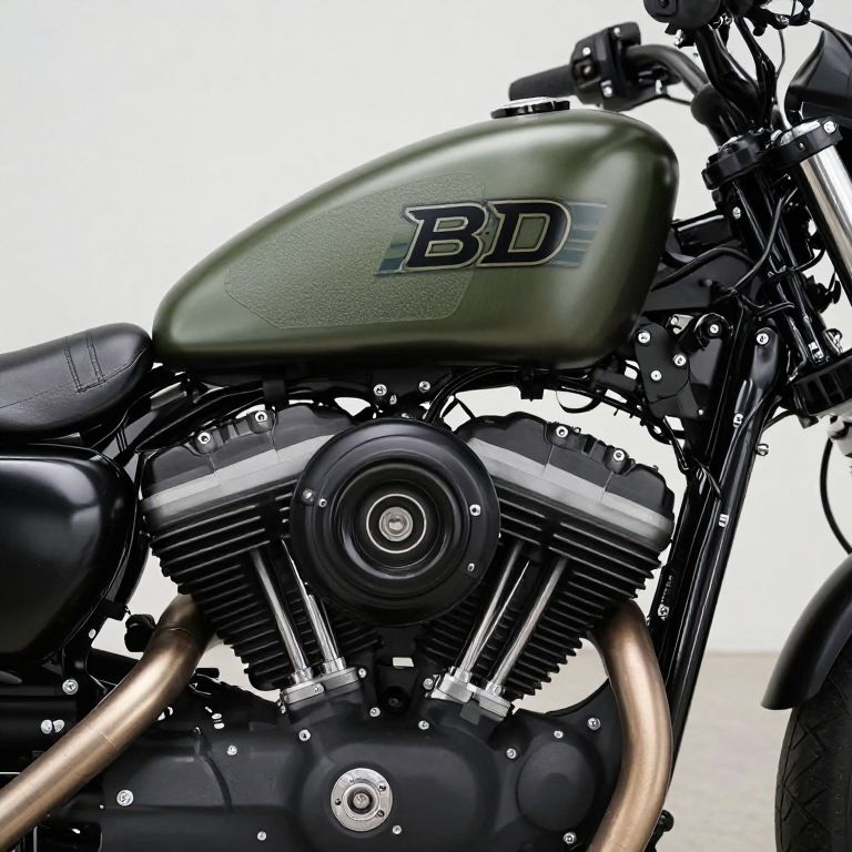 Close-up view of the 2021 Harley-Davidson Iron 883™ showcasing its olive-green fuel tank with bold \"BD\" branding and textured paneling, mounted above a robust black engine assembly in Vacaville, California.