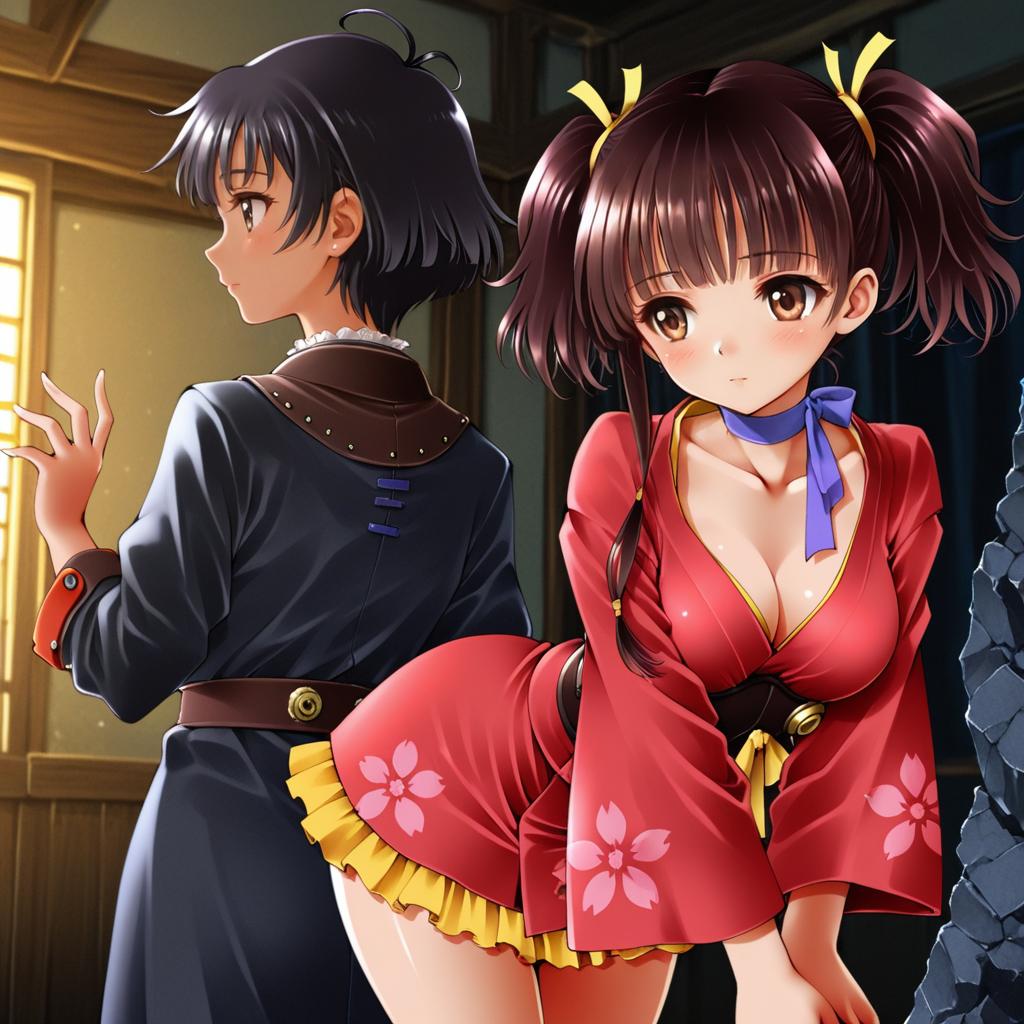 This digital anime-style illustration features two young women in a traditional Japanese setting. The woman on the left has short black hair, wears a dark blue kimono with a brown sash, and is turned slightly to the side, looking out a window. The woman on the right has brown pigtails with yellow ribbons, wears a red kimono with a low neckline revealing ample cleavage, yellow trim, and a blue ribbon choker. She is leaning forward, smiling slightly. The background shows a wooden interior with a sunlit window. The image has bright, vibrant colors and a warm, inviting atmosphere.
