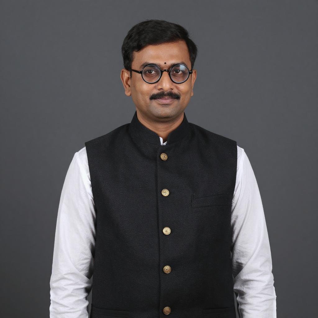 Portrait of an Indian man wearing a traditional early 20th-century Bengali formal outfit consisting of a white kurta-pajama and a black waistcoat with gold buttons. He has short neat black hair, a mustache, and round black-rimmed glasses. The background is a plain solid dark gray color.