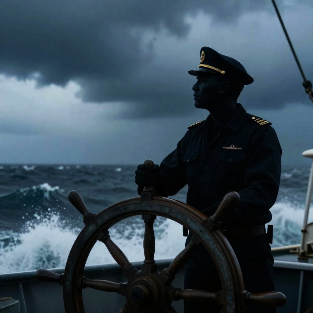 Realistic photo.A silhouette of a ship captain steering amid a storm, with a faded background of churning sea, color palette of dark blues and stormy grays, evoking bravery, turmoil, resilience, subtle nautical symbols. realistic photo