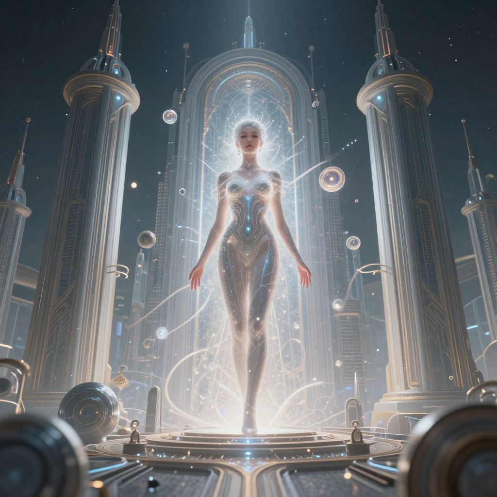 A CGI digital artwork depicts a futuristic, glowing, androgynous figure standing at the center of a radiant, holographic aura. The figure, with pale skin and a sleek, silver bodysuit adorned with intricate patterns, stands on a metallic platform. Surrounding them are towering, cylindrical structures with illuminated, metallic surfaces. Floating orbs and glowing lines emanate from the figure, enhancing the sci-fi atmosphere. The background is a dark, starry sky, contrasting with the bright, ethereal glow of the figure and the structures. The image combines elements of cyberpunk and futuristic fantasy.