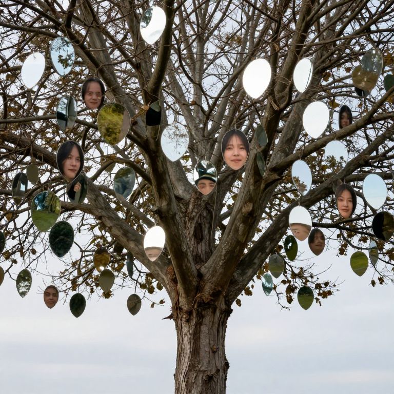 A single tree with reflective bark hosts thousands of floating mirrors, each showing fragments of a different person’s face.