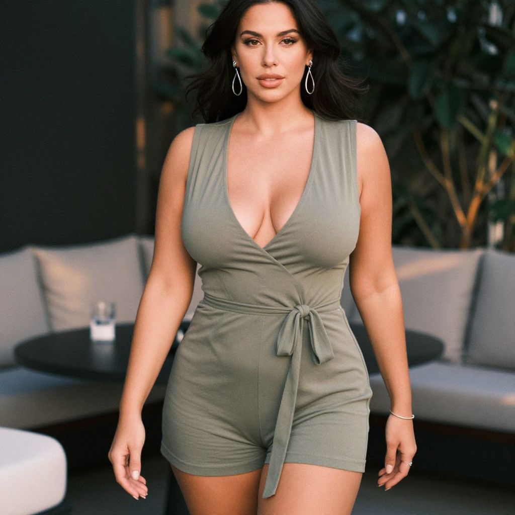 Photograph of a curvy woman with long black hair, wearing a deep V-neck, olive-green romper with a tied waist, standing outdoors on