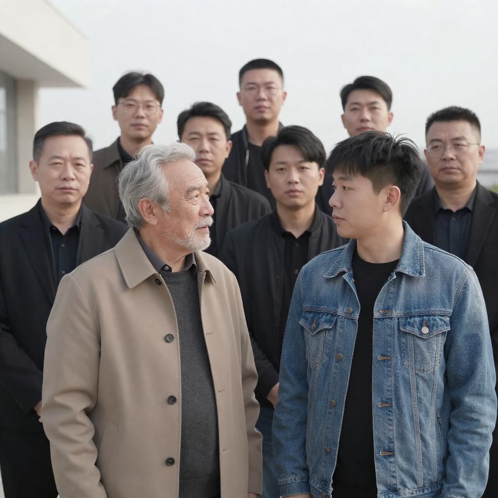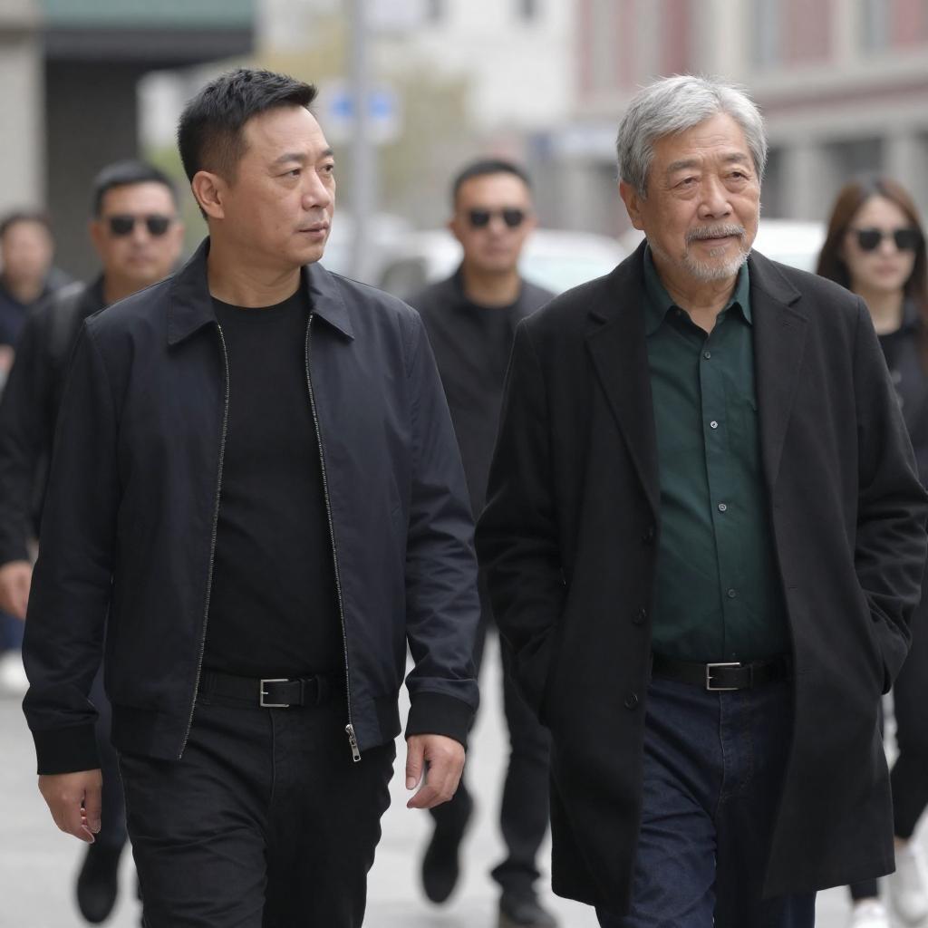 Photograph of two men walking together in a city street. The man on the left has short black hair, wears a black shirt and jacket, and looks to the right. The older man on the right has gray hair, a beard, and wears a dark green shirt with a black coat. Several people in the background are blurred, with some wearing sunglasses. The scene is brightly lit with urban buildings in the background.