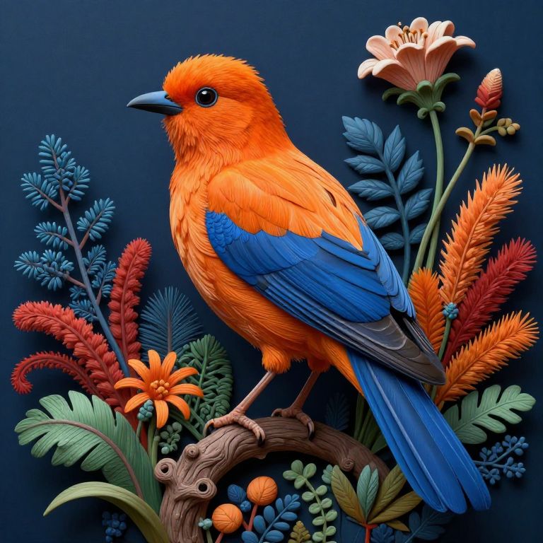 The image is a highly detailed, 8K illustration that masterfully manipulates nature in an artistic manner. Dominating the scene is a large, vibrant bird with striking orange and blue feathers, perched amidst an intricate arrangement of flora and fauna. The bird's feathers are vividly rendered, with a mix of smooth and textured surfaces that add depth and realism to the image. Surrounding the bird are various plants and flowers, each meticulously detailed, showcasing a range of colors from deep blues and greens to warm oranges and reds. The plants exhibit a variety of textures, from soft, feathery leaves to rough, gnarled branches, creating a rich tapestry of natural elements. The composition is dynamic, with the bird positioned centrally, drawing the viewer's eye to its intricate details. The background is a deep, dark blue, which contrasts sharply with the bright colors of the bird and plants, enhancing the overall vibrancy of the scene. The interplay of light and shadow adds a sense of depth and realism, making the image appear almost three-dimensional. The overall effect is a stunning, ultra-detailed representation of nature, where every element is carefully crafted to create a harmonious and visually captivating composition.