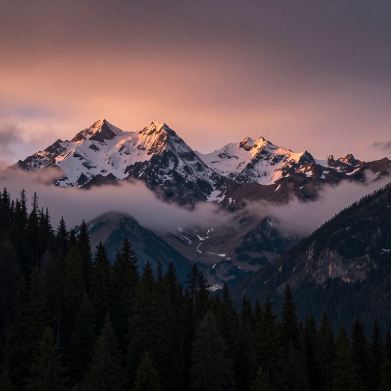 Dramatic peaks stand majestically against a twilight sky, their snow-capped summits bathed in warm hues as clouds drift low among dense evergreen forests below.