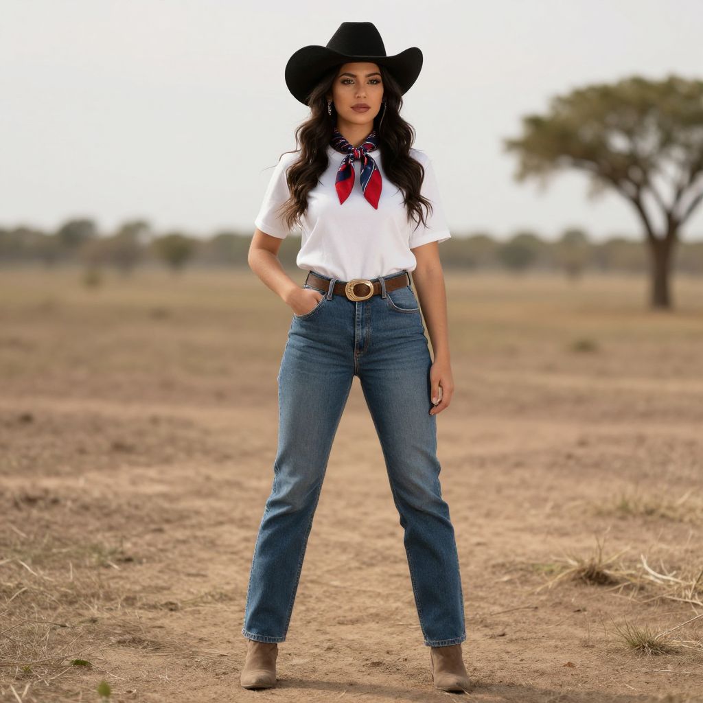 Photograph of a young woman standing confidently on a dirt path in a dry, open field. She has long, wavy black hair, wearing a black cowboy hat, white short-sleeved shirt with a red and blue bandana tied around her neck, and high-waisted blue jeans with a brown belt featuring a large buckle. She completes her outfit with tan ankle boots. The background is slightly blurred, showing a tree and a flat, grassy landscape under a cloudy sky. Her hands are in her jeans pockets, and she gazes directly at the camera with a calm expression.