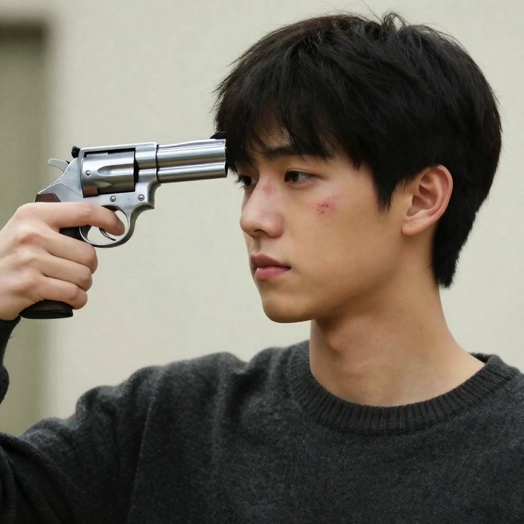 Close-up photograph of a young Asian man with short, dark hair, wearing a thick, dark gray sweater. He has a slight bruise on his right cheek and is looking intently to the left. A hand holds a silver revolver, pointing it at his forehead from the left side of the image. Background is softly lit and blurred.
