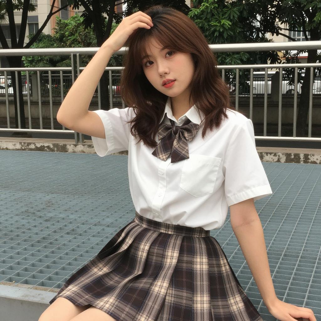 Young Asian girl crouching on a sidewalk next to a black messenger bag. She has straight brown bob haircut and wears a navy school uniform featuring a white collar, green plaid skirt, and white socks with black shoes. The background includes metal railings, potted plants, and an apartment building. The bag has a purple zipper and a silver emblem.