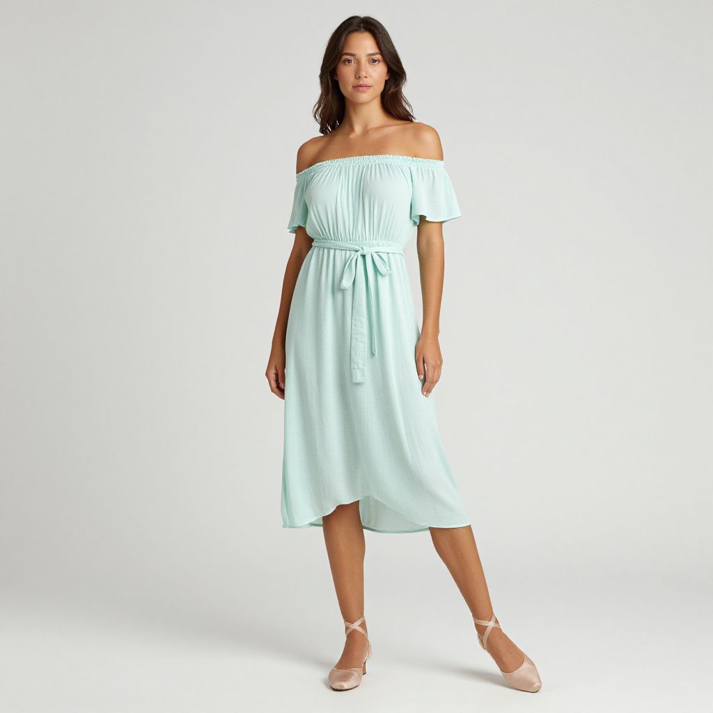 "Woman, bohemian chic, pale mint green off-the-shoulder midi dress, elasticated neckline, short flutter sleeves, fabric waist tie, relaxed fit silhouette, pointed nude ballet flats with ankle straps, minimal jewelry, natural makeup, white studio background.. Sexy. Pretty face and beаutiful eyes. Big breasts."