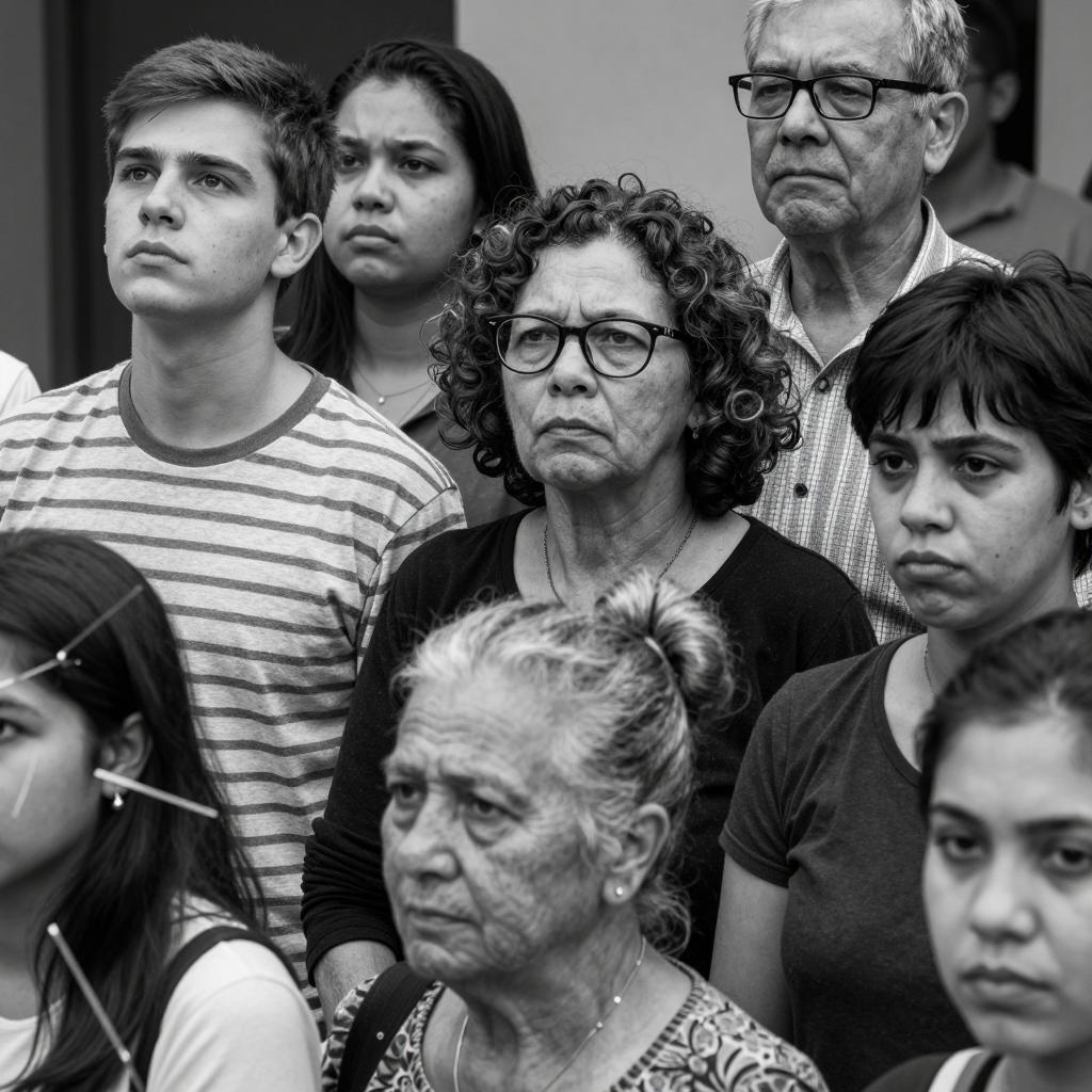 Black and white photograph of a crowded group of people outside a bar. Men and women with various expressions, some looking forward, others to the side. Elderly woman in center, wearing patterned top, has neutral expression. Woman with curly hair to the left looks serious. Man with glasses and patterned jacket in background looks forward. Foreground has blurred figure with hat. Reflections on glass in background. Sign "BAR" visible in background. 9 people in total.