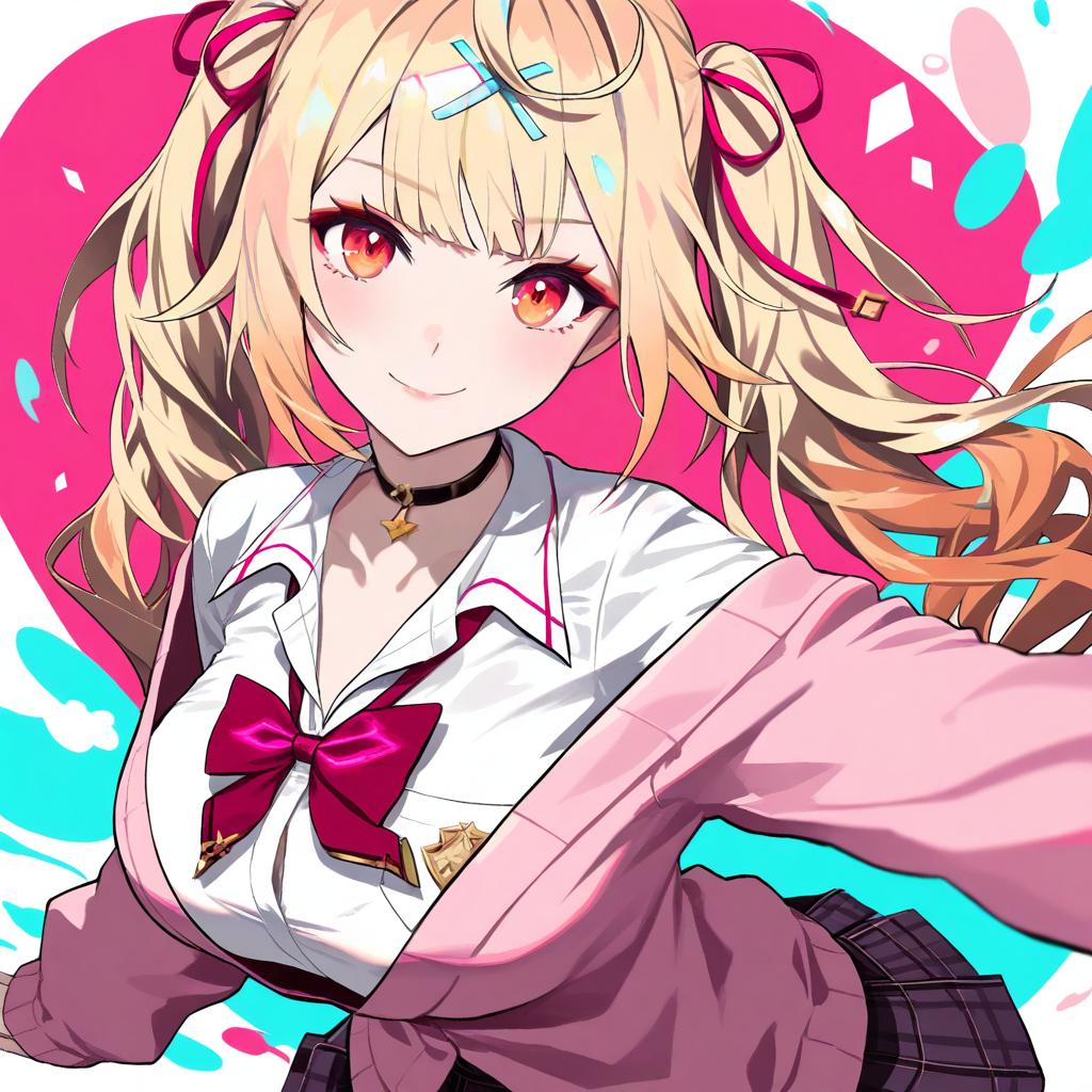 Digital illustration of an anime-style girl with blonde twintails tied with red ribbons, wearing a pink cardigan over a white collared shirt with a red bowtie, and a plaid pleated skirt. The girl features large amber eyes, a black choker with a star pendant, and a school emblem on her cardigan. The background is soft with pastel colors and subtle sparkles.