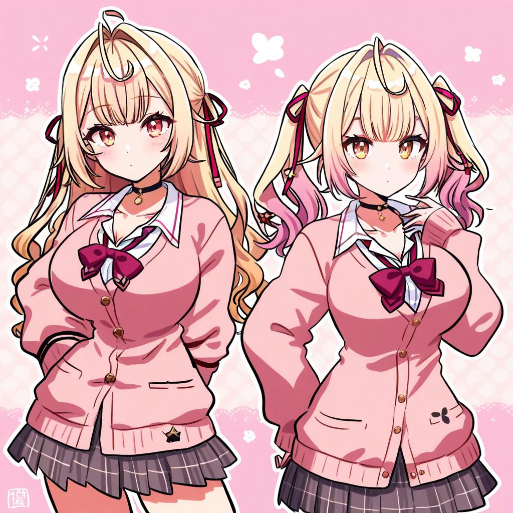 Hoshikawa sara (4th costume), nijisanji, 1girl, heterochromia, red eyes, yellow eyes, blonde hair, long hair, twintails, ahoge, hair ribbon, large breasts, school uniform, school uniform, white shirt, collared shirt, pleated skirt, plaid skirt, long sleeves, red bowtie, red ribbon, black choker, virtual youtuber, virtual youtuber, pink cardigan, by artist chikado, leet