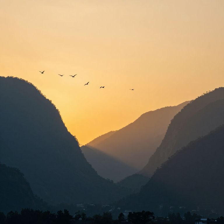 Photograph of a serene sunset over layered, silhouetted mountains with a gradient sky from orange to yellow, and a flock of birds flying in