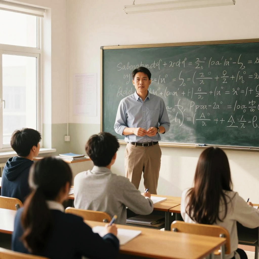 Authoritative teacher standing in front of a chalkboard filled with complex equations, classroom filled with attentive students, early morning sunlight streaming through windows, confident expression, warm tones and realistic style capturing a moment of leadership.