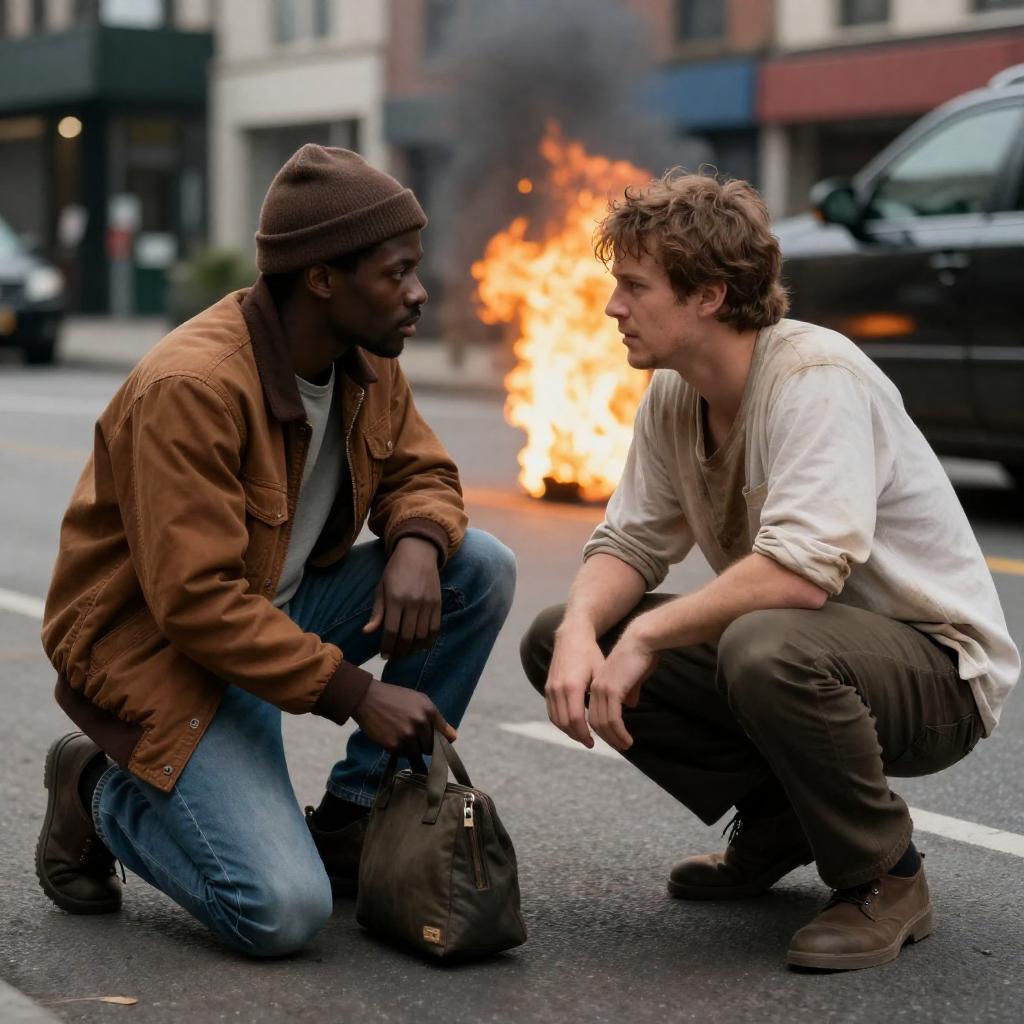 Two men engaged in intense conversation on an urban street. One is a Black man wearing a brown beanie, brown jacket, blue jeans, and black boots, kneeling while holding a dark-colored bag. The other is a white man with messy brown hair, dressed in a dirty white shirt, brown pants, and brown shoes, crouching and facing the first man. A bright fire burns behind the white man, with a black car and buildings visible in the background.