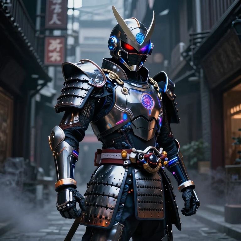 Cybernetic samurai robot with glowing blue and red eyes, metallic armor, and futuristic design, standing in a misty, neon-lit