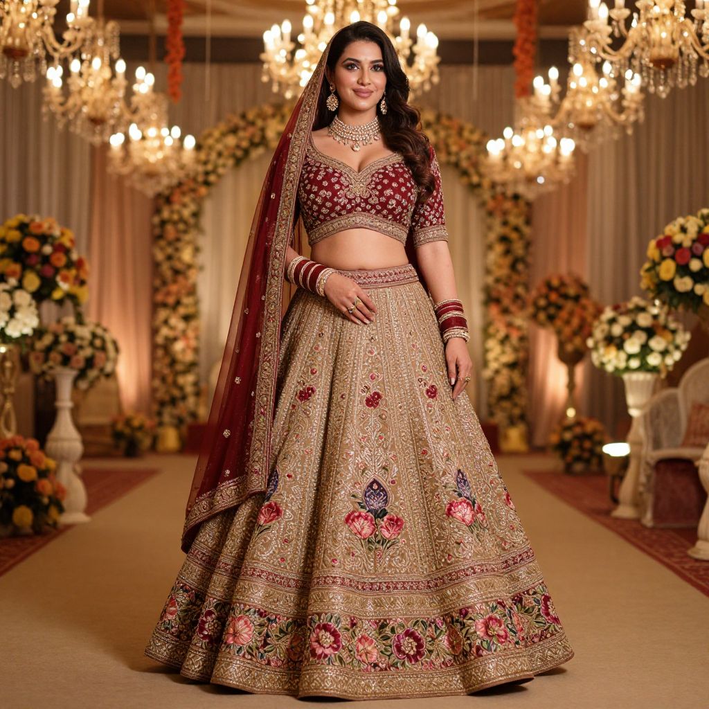 A beautiful Indian woman in her late 20s with warm brown skin, deep brown eyes, and a graceful smile wearing a luxurious lehenga design for marriage, featuring intricate zari work, floral patterns, and a gold border; the lehenga is matched with a red silk dupatta and traditional juttis, set against a backdrop of a traditional wedding hall with ornate chandeliers and vibrant floral decorations.. The woman has big tits and cute face