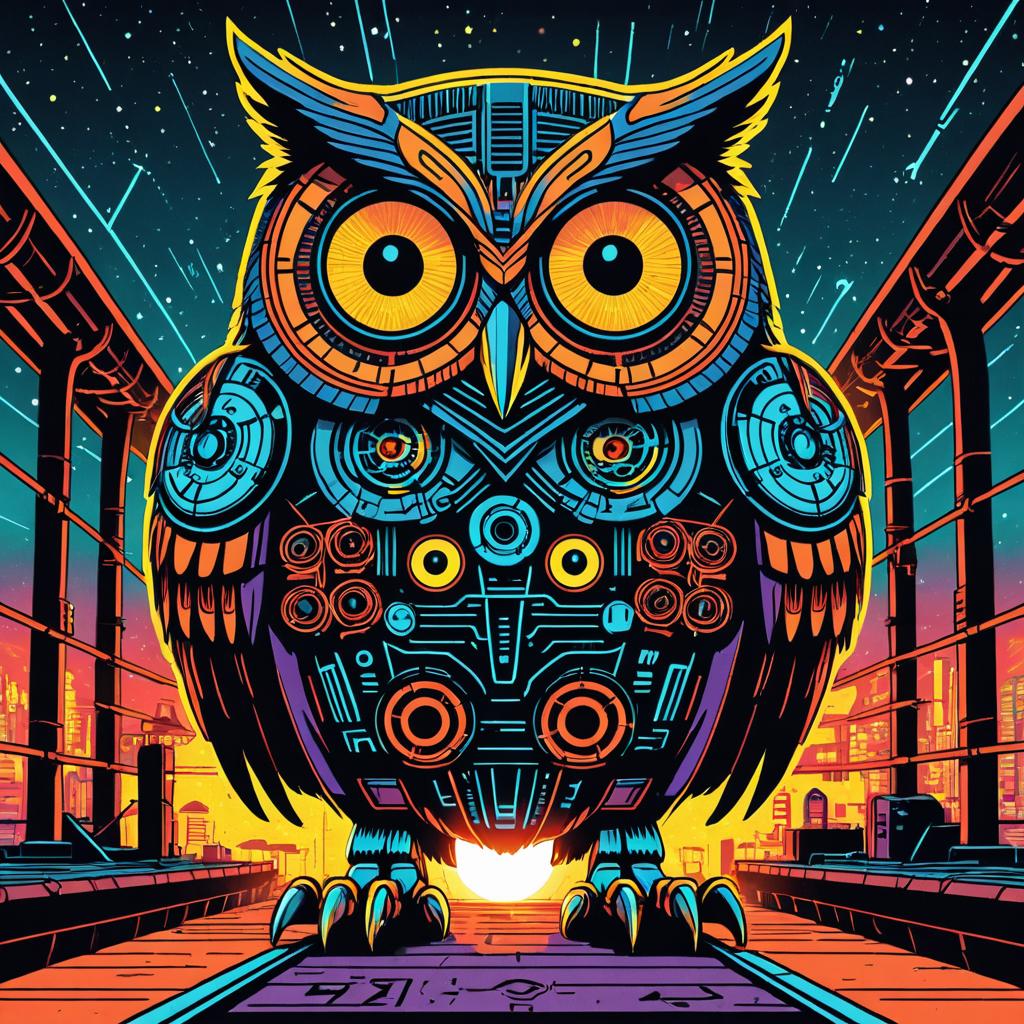 Colorful Cybernetic Owl at Neo-Seoul Space Pier