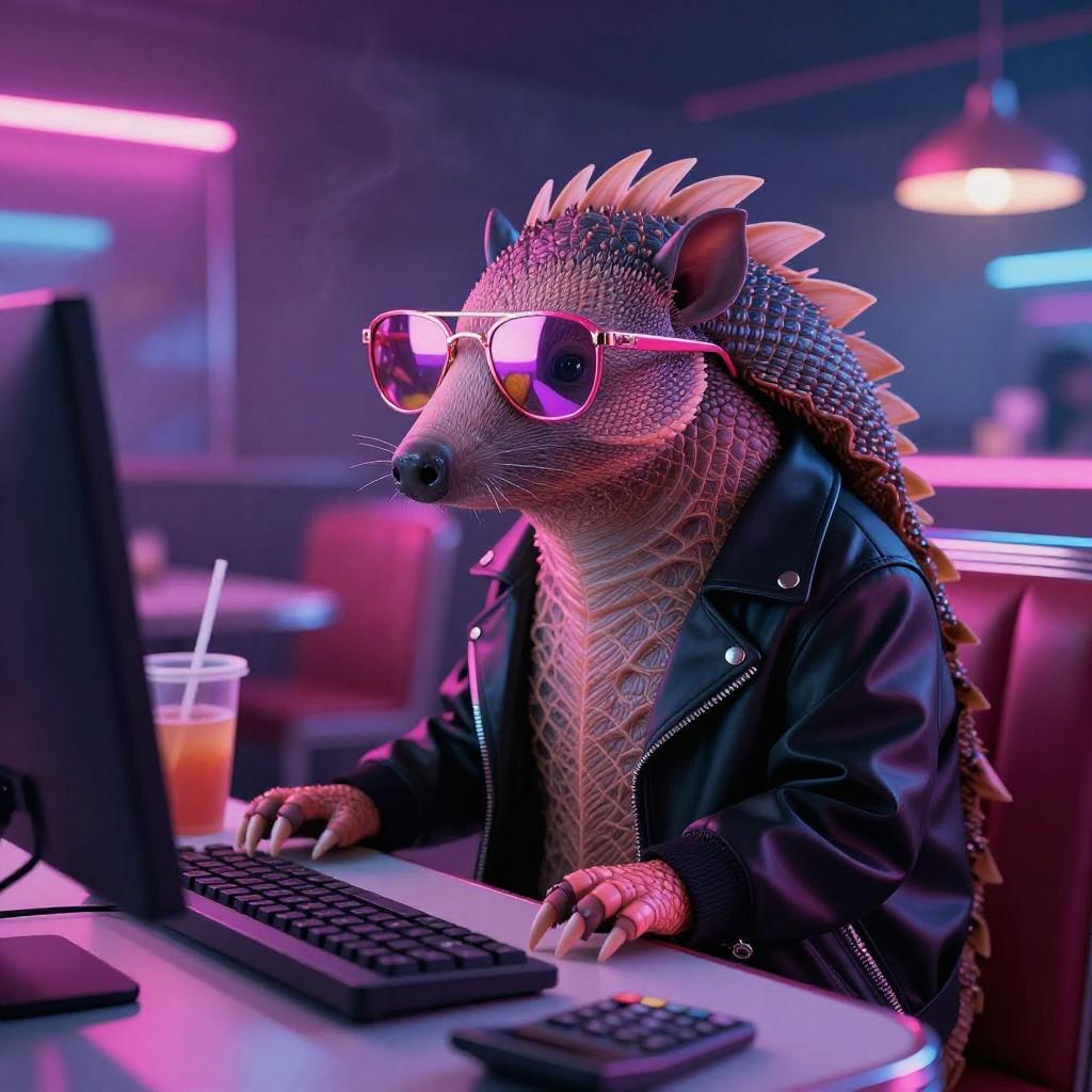 A surreal digital illustration of a funky armadillo with textured reptilian skin wearing pink reflective sunglasses and a black stylish jacket, sitting at a computer keyboard in a neon-lit retro diner. The atmosphere is enhanced by vibrant pink, purple, and blue neon lights creating a smoke-filled, moody ambiance. On the desk, there is a drink cup with a straw and a calculator, adding to the diner setting.