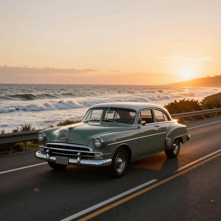 Photograph of a classic green 1950s Chevrolet sedan driving along a coastal road at sunset. The car, with chrome accents and a rounded design, is positioned in the foreground on the left side of the road, which has two yellow lines and a white dividing line. The background features a vibrant orange and pink sunset over the ocean, with waves crashing onto the shore. The sky is partially cloudy, and the sun is low on the horizon, casting a warm glow. Bushes and a metal guardrail line the roadside. The car's windows are rolled up, and it has a vintage, polished look.