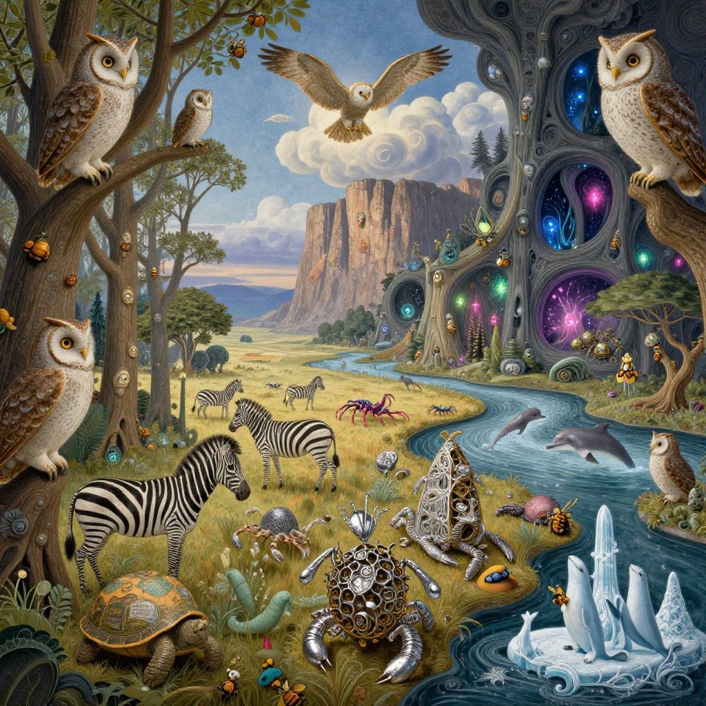 Whimsical fantasy landscape: owls perch on trees, zebras graze, tortoises roam, waterfalls flow, colorful caves, mountains