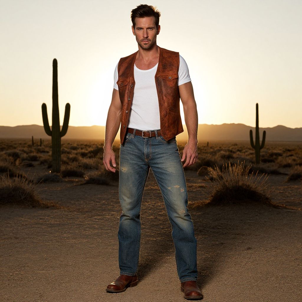 A man, rugged brown leather vest, faded blue denim jeans, white crew-neck t-shirt, brown leather boots, distressed finish, arid desert landscape, scattered cacti, golden sunset, cinematic film style, confident expression. Man has masculine face and piercing eyes