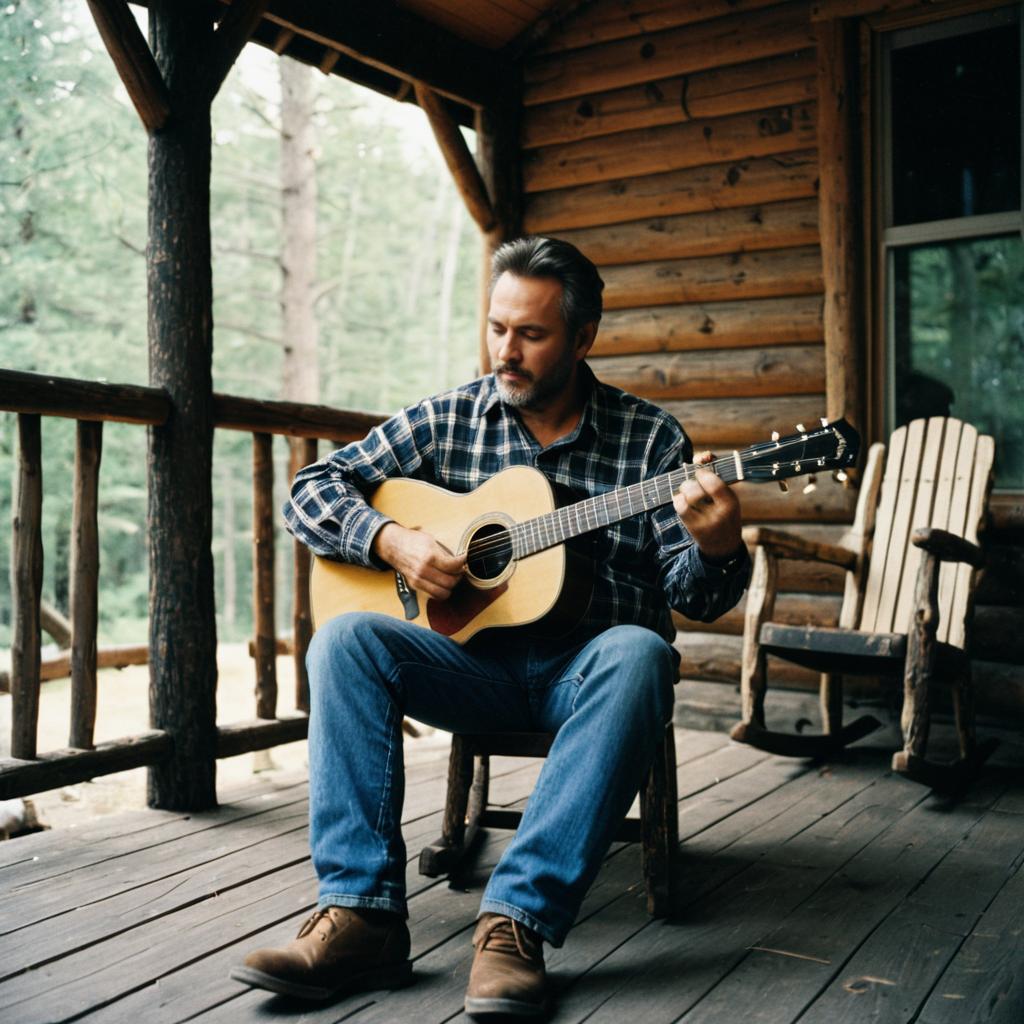 Kodak Portra cinematic film still of a middle-aged man playing an acoustic guitar, plaid shirt and worn jeans, sitting on the porch of a rustic cabin, calm and introspective vibe.