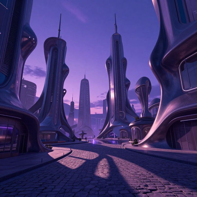 An enigmatic digital artwork portrays an ethereal landscape where fluid architecture intertwines with futuristic cityscapes. The scene is characterized by organic shapes merging with metallic textures in a low-angle view, creating a bizarre metropolis that defies conventional time perception. towers morph into abstract sculptures casting distorted shadows on cobblestone streets under a rich palette of purple and blue twilight hues. Neon-lit waterways reflect the city's paradoxical essence, blending advanced technology with whimsical imagination in a captivating dance of light and shadow that invites contemplation on the interplay between reality and fantasy.