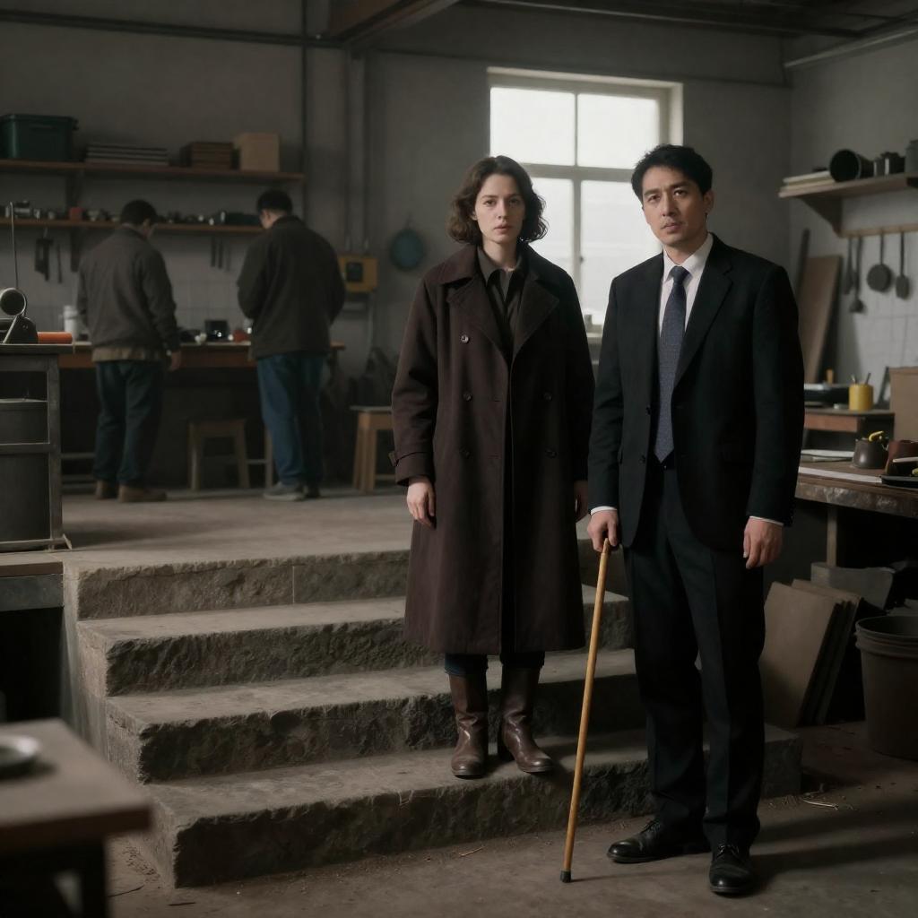 Photograph of a dimly lit, industrial workshop with stone steps. A woman in a long, dark brown coat and brown boots stands beside a man in a black suit and tie, holding a cane. Background includes workers in casual clothes, shelves with tools, and bright light from a window.