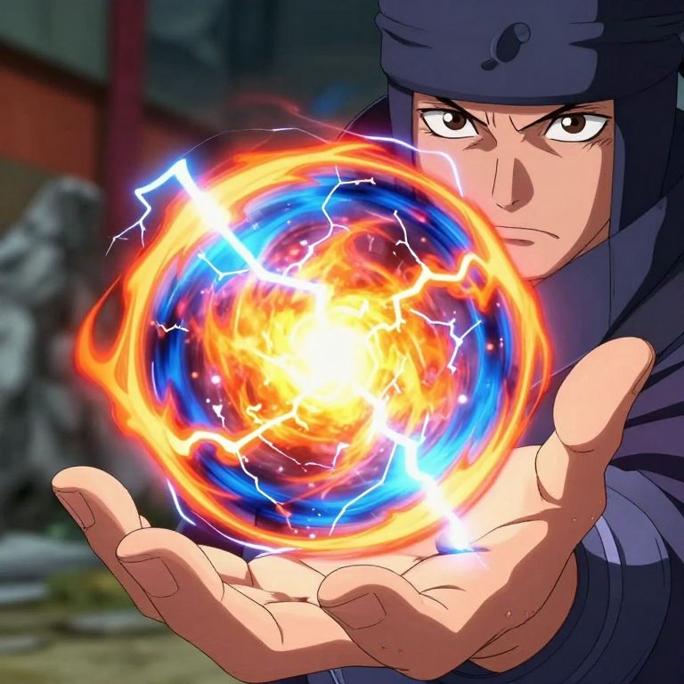 Close-up of the rasegan energy sphere spinning rapidly in ninja's palm, electric blue and fiery orange mixed with cracks of lightning, detailed skin texture and intense eyes, vibrant anime-style illustration, blurred action backdrop