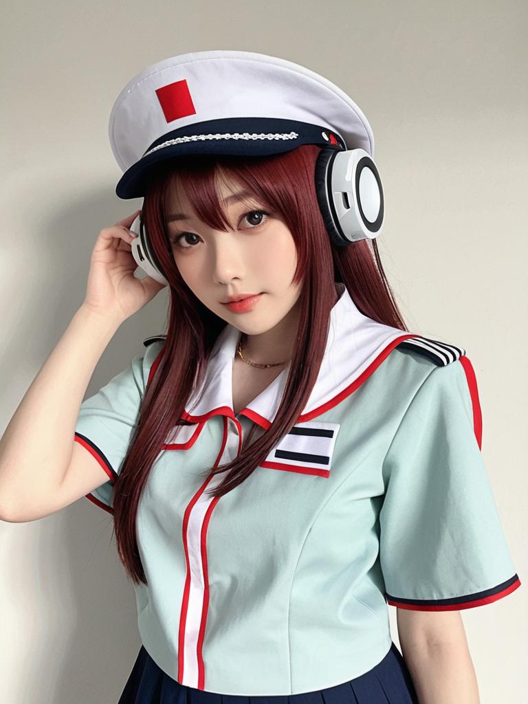 Young woman cosplaying as The Speaker from Vividred Operation wearing a light blue short-sleeve sailor-style top with red and black trim, a white sailor collar, a matching white hat with a red square detail, and large white headphones. She has long reddish-brown hair and a subtle makeup look, posing against a plain background.