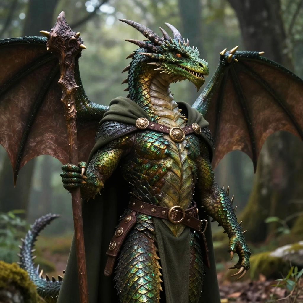 Zrpgstyle, medieval fantasy portrait of a dragon, green and brown scales, (dragon) wearing a simple cloak, holding a wooden staff, forest background, soft lighting, (masterpiece:1.2) (illustration:1.2) (best quality) (concept art) (character art) (detailed) (intricate) (8k) (HDR) (wallpaper) (cinematic lighting) (sharp focus)
