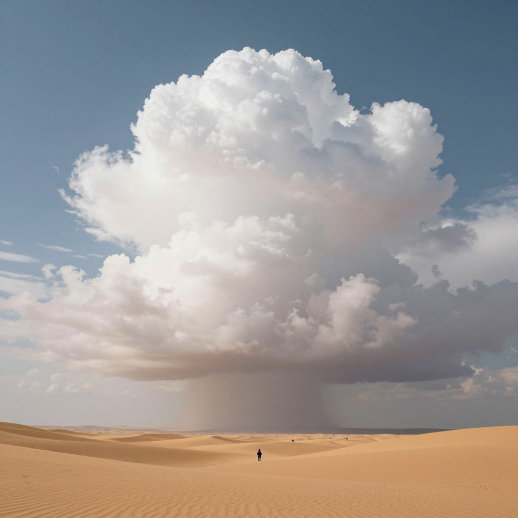 Photograph of vast desert with rippling sand dunes under a massive, bright white cumulus cloud against a blue sky. Small figure walks in the