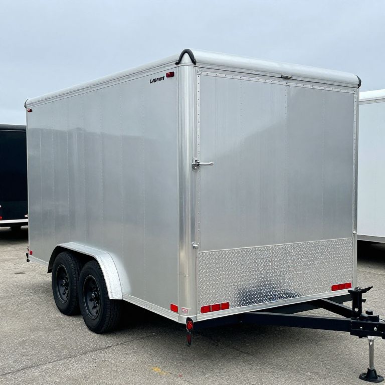 New Legend Deluxe V-Nose 7' x 15' all-aluminum enclosed cargo trailer showcased outdoors, featuring a sleek silver finish, diamond plate rear panel, dual axles, and a hitch assembly, ready for sale.