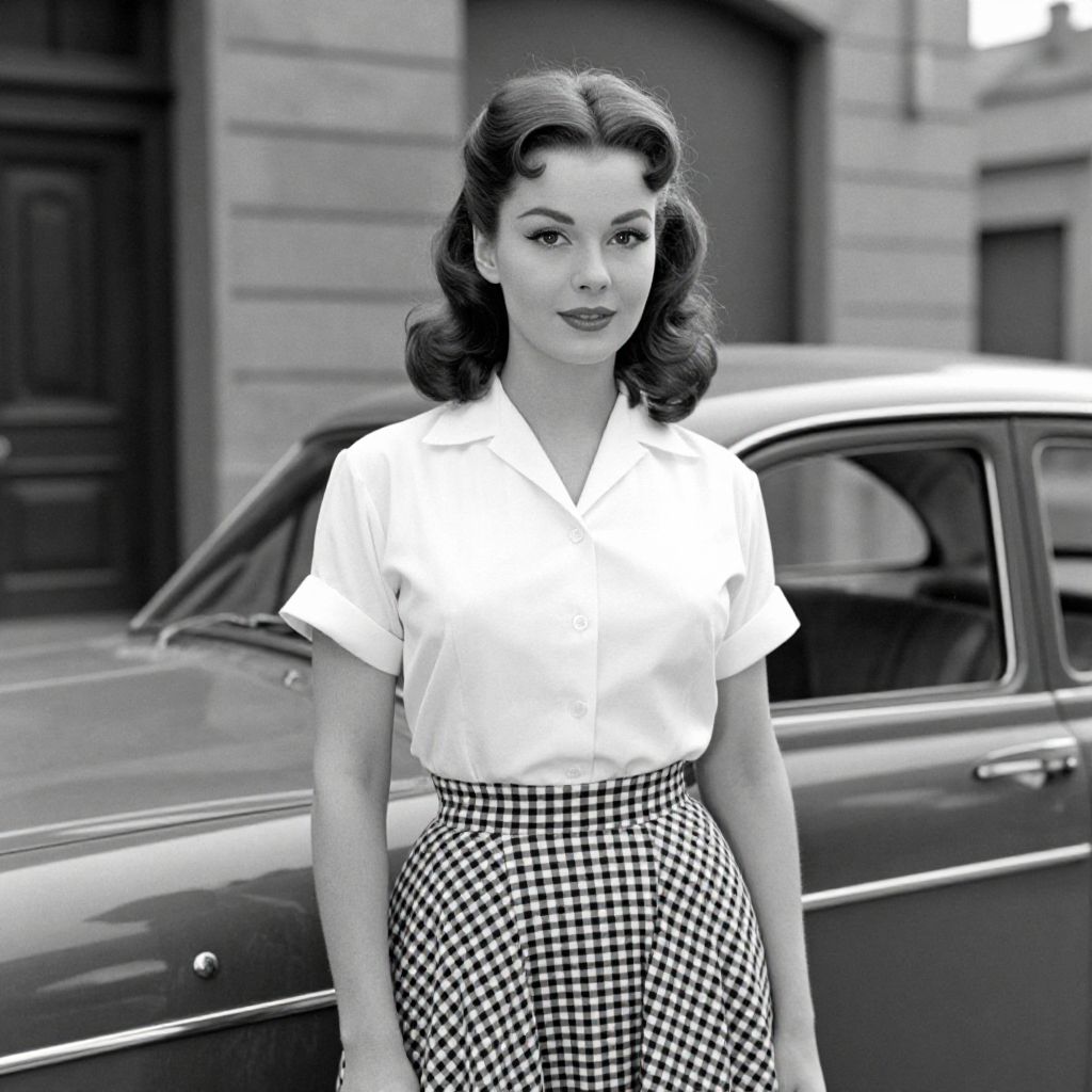 A vintage black-and-white photograph captures a woman in classic 1950s fashion, featuring a crisp white blouse paired with a stylish gingham skirt, evoking the timeless elegance reminiscent of Brigitte Bardot, set against a nostalgic urban backdrop with retro cars and architectural details.