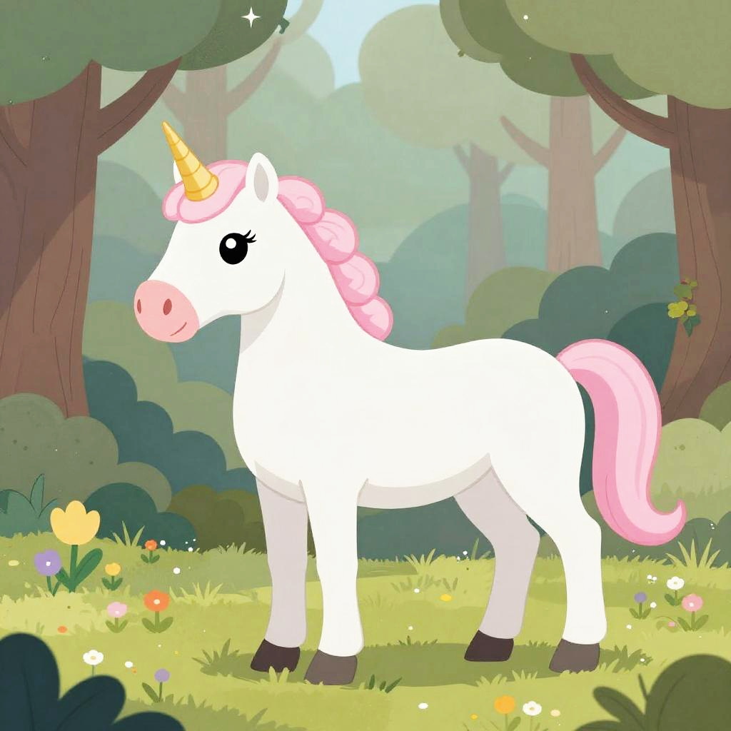 A unicorn in a radiant spring, all set against a softly blurred background that suggests a magical forest.