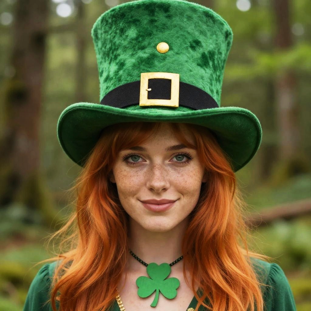 Score_9, score_8_up, score_7_up, score_6_up, score_5_up, score_4_up, 1girl, freckles, realistic, orange hair, beautiful eyes, wearing a shamrock necklace, leprechaun top hat, leprechaun woman, lush green irish forest background, rating_safe, shy smile, luscious lips